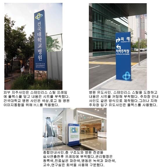 ÈÞ¸Ó´ÏÆ¼ °Á¶ÇÑ H.I. µµÀÔ Áö³ 8¿ù 1ÀÏ 74³â ¿ª»ç¸¦ °£Á÷ÇÏ°í ´Ù½Ã ÅÂ¾î³ »õ·Î¿î °Ç±¹´ëÇб³º´¿øÀº ¿¬¸éÀû 2¸¸ 5õ Æò, ÁöÇÏ 4Ãþ, Áö»ó 13Ãþ ±Ô¸ð¿¡ 870°³ º´»óÀ» °®Ãß°í ÀÖ´Ù. ÃÑ 31°³ Áø·á°ú°¡ ÀÖ°í À̿ʹ º°µµ·Î ¼Òȱ⼾ÅÍ, ½ÉÀåÇ÷°ü¼¾ÅÍ, ³ú½Å°æ¼¾ÅÍ, È£Èí±â¼¾Å͸¦ ¿î¿µÇÑ´Ù. »õ º´¿øÀº ÃÖ÷´Ü µðÁöÅÐ ±â¼úÀ» µµÀÔÇØ Áø·áÀÇ ÁúÀ» ³ô¿´À¸¸ç, Åë¿øÄ¡·á ±â´ÉÀ» ´ëÆø °ÈÇß´Ù. ¶Ç ÁöÇÏö 2È£¼±°ú 7È£¼±ÀÌ ±³Â÷ÇÏ´Â °Ç´ëÀÔ±¸¿ª¿¡¼ º´¿ø±îÁö ÁöÇÏ ¿¬°á Åë·Î¸¦ ¼³Ä¡ÇÔÀ¸·Î½á Á¢±Ù¼ºÀ» ³ô¿´´Ù. °Ç±¹´ëÇб³º´¿øÀº ¿ø³»¿¡¼ À̵¿°Å¸®°¡ ¸Å¿ì ª´Ù. ¿Ü·¡ Àü Áø·á°ú´Â ¹°·Ð °¢Á¾ °Ë»ç½ÇÀ» ÁöÇÏ 1Ãþ¿¡¼ Áö»ó 2Ãþ±îÁö ÇÑ ´«¿¡ ´Ù µé¾î¿Ã ¸¸Å ÁýÁß ¹èÄ¡ÇßÀ¸¸ç, ¿¤¸®º£ÀÌÅÍ¿Í ¿¡½ºÄ÷¹ÀÌÅͰ¡ À̵¿À» µ½´Â´Ù. ƯÈ÷ ½Å¼ÓÇÑ °£È£ ¼ºñ½º Á¦°ø¿¡ ÇÙ½ÉÀ̶ó ÇÒ Æò±Õ °£È£ µ¿¼±Àº ¿ì¸®³ª¶ó¿¡¼ °¡Àå ªÀº 13.5¹ÌÅÍ¿¡ ºÒ°úÇÏ´Ù. ÀÌ´Â ÀÇ·áÁø, °£È£»ç µî °¢ ºÐ¾ß »ç¿ëÀÚµéÀÌ º´¿ø ¼³°è Ãʱâ´Ü°èºÎÅÍ Á¦½ÃÇÑ ÀǰߵéÀ» ÃæºÐÈ÷ ¹Ý¿µÇÑ °á°ú´Ù. °Ç±¹´ëÇб³º´¿øÀº H.I.(Hospital Identity)¸¦ ±¸ÃàÇØ »õ·Î¿î º´¿øÀ¸·Î µµ¾àÀ» ²ÒÇß´Ù. ½Éº¼·Î°í´Â ¿ÃÄ¿¹Â´ÏÄÉÀ̼ǿ¡¼ µðÀÚÀÎÇß´Ù. ¿ÃÄ¿¹Â´ÏÄÉÀÌ¼Ç ±è¿µ±â ½ÇÀåÀº ¡°°Ç±¹´ëÇб³º´¿øÀÌ ½ÅÃà °³¿øÇÏ¸é¼ »õ·Î¿î À̹ÌÁö ±¸ÃàÀÌ Áß¿äÇß´Ù. ¡®Çѱ¹Á¦ÀÏÀÇ ¾ËÂù º´¿ø¡¯À̶ó´Â ¸ðÅä ¾Æ·¡ »ç¶û°ú ¹ÏÀ½À» ±âº»À¸·Î Ä¡·áÇÑ´Ù´Â ÈÞ¸Ó´ÏÆ¼¸¦ °Á¶Çß´Ù¡±°í ¹àÇû´Ù. ½Éº¼·Î°í´Â ÇÏÆ® µÎ °³°¡ Åõ¸íÇÏ°Ô ÇÕÃÄÁ® ½ÊÀÚ°¡¸¦ ÀÌ·é´Ù. À̰ÍÀº ȯÀÚ Áß½ÉÀÇ ÅëÇÕÀÇ·á ¼ºñ½º¿Í ±¸¼º¿øÀÇ ÈÇÕ°ú ºÀ»çÁ¤½ÅÀ» Ç¥ÇöÇÑ °ÍÀÌ´Ù. ¶óÀÌÆ®±×¸°Àº »ý¸í, ¶óÀÌÆ®ºí·ç´Â ¾ÈÁ¤, ºí·ç´Â Àü¹®¼ºÀ» ³ªÅ¸³½´Ù. ½Éº¼·Î°í´Â »çÀο¡µµ Àû¿ëÇß´Ù. »çÀÎÀº º´¿øÀ̹ÌÁöÅëÇÕ Â÷¿ø¿¡¼µµ Áß¿äÇÑ ¿ä¼Ò±â ¶§¹®ÀÌ´Ù. ½ÇÁ¦Å©±â·Î Á¦ÀÛÇÑ ÈÄ °¡¼³Ä¡ ÀÛ¾÷À¸·Î À§Ç躯¼ö ÁÙ¿© »çÀÎ ±âÃʼ³°è´Â ¿ÃÄ¿¹Â´ÏÄÉÀ̼ǿ¡¼ ´ã´çÇß°í, ÇöÀå »óȲ¿¡ ¸Â°Ô ¼öÁ¤ÀÛ¾÷À» °ÅÄ¡´Â ½Ç½Ã¼³°è´Â ½ÅÀϱâȹ¿¡¼ ÁøÇàÇß´Ù. ü°èÀûÀÎ »çÀνýºÅÛ ±¸ÃàÀ» À§ÇØ º´¿ø Ãø 3¸í°ú ½ÅÀϱâȹ »çÀÎ ´ã´çÀÚ 3¸íÀ¸·Î Àü´ãÆÀÀ» ±¸¼ºÇØ ¼¼½ÉÇÑ ½Å°æÀ» ±â¿ï¿´´Ù. À̹ø »çÀÎ ÀÛ¾÷¿¡¼´Â ¹«¾ùº¸´Ù ÇöÀå°¨À» ÀÍÈ÷´Â °ÍÀÌ Áß¿äÇß´Ù. ³»ºÎȯ°æ¿¡ µû¶ó »çÀÎÀÇ ÇüÅÂ, Å©±â, À§Ä¡ µîÀ» Á¤ÇؾßÇϱ⠶§¹®ÀÌ´Ù. µû¶ó¼ ½Ç½Ã¼³°è¸¦ ´ã´çÇÑ ½ÅÀϱâȹÀº »çÀÎÀÛ¾÷ÀÌ À̾îÁö´Â ÇÑ ´Þ°£ º´¿ø¿¡ »óÁÖÇÏ¸é¼ »çÀÎÀÛ¾÷À» ÁøÇàÇß´Ù. ÀÌ´Â ¡®È¯ÀÚÀÇ ÀÔÀå¿¡¼ »çÀÎÀ» ¼³Ä¡ÇØ¾ß ÇÑ´Ù¡¯´Â º´¿ø Ãø ¹æÄ§¿¡ µû¸¥ °ÍÀÌ´Ù. °Ç±¹´ëÇб³º´¿ø È«º¸ÆÀ ±ÇÇõÁø ÆÀÀåÀº ¡°À§Ç躯¼ö¸¦ ÁÙ¿© ¹®Á¦°¡ ¹ß»ýÇÏÁö ¾Êµµ·Ï Çϱâ À§ÇØ »çÀÎÀ» ½ÇÁ¦·Î ¼³Ä¡Çϱâ Àü¿¡ ¼ö·®, ÇüÅÂ, ¼³Ä¡ À§Ä¡ µîÀ» Á¤È®ÇÏ°Ô Á¶»çÇß´Ù¡±°í ¼³¸íÇÑ´Ù. À̸¦ À§ÇØ °¢ ºÎ¼¿¡ ÇùÁ¶¸¦ ¹Þ¾Æ ÇÊ¿äÇÑ »çÀÎ ¼ö·®À» ÆÄ¾ÇÇß´Ù. »çÀÎ °¡¼³Ä¡ ÀÛ¾÷ ÈÄ¿¡µµ °¢ ºÎ¼º°·Î È®ÀÎÀ» ¹Þ¾Æ ºÒÇÊ¿äÇÑ »çÀΰú ²À ÇÊ¿äÇÑ »çÀÎÀ» °áÁ¤Çسª°¬´Ù. °¡¼³Ä¡ ÀÛ¾÷Àº ÇöÀå»óȲ¿¡ ¸ÂÃç ¼ö·®, ÇüÅÂ, Å©±â µîÀ» Á¶ÀýÇÒ ¼ö ÀÖ¾î ¸¹Àº µµ¿òÀÌ µÆ´Ù. ±ÇÇõÁø ÆÀÀåÀº Ä¿ÆÃ±â¸¦ ±¸ÀÔÇØ ½ÇÁ¦·Î ÇÊ¿äÇÑ ³»¿ë µîÀ» ºÎÂøÇÏ´Â ¿¼ºÀ» º¸¿©Áֱ⵵ Çß´Ù.