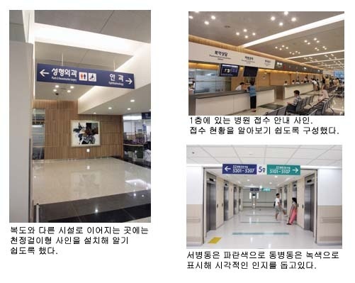 »ö»óÀ¸·Î ±¸¿ªÀ» ´Þ¸®ÇØ ½Ã°¢Àû ÀÎÁö µµ¿Í º´¿øÀ̶ó´Â Ư¼ö¼ºÀ» °¨¾ÈÇØ »çÀÎ ±ÛÀÚ¸¦ Å©°Ô Ç¥½ÃÇß´Ù. µðÀÚÀÎÀº ´Ù¼Ò ¶³¾îÁö´õ¶óµµ ȯÀÚ ÀÔÀå¿¡¼ »ý°¢ÇØ ±â´ÉÀ» ¿ì¼±½ÃÇß´Ù. º´¿øÀÌ ÁöÇÏ 1ÃþºÎÅÍ 4Ãþ±îÁö Æ®¿© ÀÖ´Â ¾ÆÆ®¸®¿ò ±¸Á¶·Î µÅ ÀÖ¾î »çÀÎ ½Ã¾ß¸¦ È®º¸ÇÒ ¼ö ÀÖ°í, »çÀο¡ Àû¿ëÇÑ »ö»óÀº ÀÎÅ׸®¾î¿Í ´ëºñ¸¦ º¸¿© ½ÃÀμºÀ» È®º¸Çϱ⿡ ÁÁ¾Ò´Ù. ¿Ü·¡¿Í º´µ¿, »ç¹«Áö¿ø ºÎ¼¸¦ »ö»óÀ¸·Î ±¸ºÐÇÏ´Â Ä÷¯ ÄÁ¼ÁÆ®¸¦ ¼³Á¤ÇØ ¹æ¹®ÀÚµéÀÇ ½Ã°¢Àû ÀÎÁö¸¦ µµ¿Ô´Ù. º´¿øÀº ÁöÇÏ 4Ãþ¿¡¼ ÁöÇÏ 2Ãþ±îÁö´Â °ü¸®ÇàÁ¤ºÎ¼°¡ À§Ä¡ÇØ ÀÖ°í, ÁöÇÏ 2ÃþºÎÅÍ 4Ãþ¿¡¼ ¿Ü·¡Áø·á°¡ ÀÌ·ïÁø´Ù. 5ÃþºÎÅÍ 11Ãþ±îÁö´Â º´µ¿, 12ÃþÀº ±³¼ö½Ç, ¿¬±¸½Ç·Î ±¸¼ºµÅ ÀÖ´Ù. ÀÌ·± ±¸¼ºÀ» Á¾Çվȳ»»çÀο¡¼ ÆÄ¾ÇÇÒ ¼ö ÀÖµµ·Ï »öÀ¸·Î ±¸ºÐÇß´Ù. ±×¸®°í ¹æ¹®ÀÚ°¡ ÇöÀç ¾î¶² À§Ä¡¿¡ ÀÖ°í, ¾î¶² Áø·á½ÇÀ» °¡¾ßÇÒ Áö¸¦ Á¤È®ÇÏ°Ô ÀÎÁöÇÒ ¼ö ÀÖµµ·Ï Ãþ ±¸Á¶µµ¿Í Ãþº° ¾È³»µµ¸¦ Ãþ¸¶´Ù ¼³Ä¡Çß°í, ÇöÀç À§Ä¡ µîÀº ³ë¶õ»öÀ¸·Î Ç¥±âÇØ ´«¿¡ ¶çµµ·Ï Çß´Ù. À̰ͻӸ¸ ¾Æ´Ï¶ó ¼º´µ¿Àº ÆÄ¶õ»öÀ¸·Î µ¿º´µ¿Àº ÆÄ¶õ»öÀ¸·Î ±¸ºÐÇØ ¾Ë±â ½±µµ·Ï Çß°í, ¸¹Àº »öÀ» »ç¿ëÇÏ´Â °ÍÀ» ÀÚÁ¦ÇØ ¹æ¹®ÀÚµéÀÇ È¥¶õÀ» ¹æÁöÇß´Ù. ÁöÇÏÁÖÂ÷ÀåÀº ¿¬µÎ»ö, ÁÖȲ»ö µîÀ¸·Î º®¸éÀ» ÆäÀÎÆÃÇØ ¾îµÎ¿î ºÐÀ§±â¸¦ ȯ±âÇß´Ù. º´¿ø ÁøÀԷδ 4±ºµ¥·Î ±× ÁøÀԷο¡ °¢°¢ ¸ÂÃç ¿¹»ó µ¿¼±´ë·Î »çÀÎÀ» ¼³Ä¡Çß´Ù. º´¿ø ³»ºÎ »çÀιèÄ¡´Â ÁÖ¿ä µ¿¼±ÀÎ ¿¡½ºÄ÷¹ÀÌÅÍ, ¿¤¸®º£ÀÌÅ͸¦ Áß½ÉÀ¸·Î Àü°³Çß´Ù. º¹µµ¿Í ´Ù¸¥ ½Ã¼³·Î À̾îÁö´Â °÷¿¡´Â õÀå°ÉÀÌÇü »çÀÎÀ» ¼³Ä¡ÇØ °¡°íÀÚ ÇÏ´Â °÷À» ¾Ë±â ½±µµ·Ï Çß´Ù.