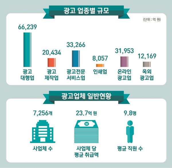 2019 ±¤°í»ê¾÷Åë°èÁ¶»ç¿¡ µû¸£¸é Àüü ±¤°í»ê¾÷ ½ÃÀå ±Ô¸ð´Â 7,256°³ »ç¾÷ü 17Á¶ 2,119¾ï ¿ø ±Ô¸ð´Ù. ÀÌ´Â ÀÛ³â 16Á¶ 4,133¾ï ¿ø ´ëºñ 4.9% Áõ°¡ÇÑ ¼öÄ¡´Ù. ÀÌ´Â ÀÛ³â Áõ°¡ ÆøÀÎ 3.9¸¦ ³Ñ¾î¼± ¼öÄ¡¶ó ¼ö³â°£ Áö¼ÓÀûÀÎ Áõ°¡¼¼¸¦ º¸ÀδÙ. ±×¸®°í ÃÖ±Ù 2³â°£ ±¤°í»ê¾÷ ±Ô¸ð¸¦ ºñ±³ÇØ ºÁµµ ¸Å³â Áõ°¡Çß´Ù.