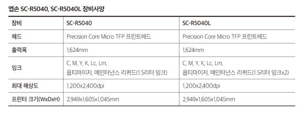 SC-R5040, SC-R5040LÀÇ °¡Àå Å« Ư¡Àº »õ·Ó°Ô °³¹ßÇÑ Precision Core Micro TFP Çìµå¸¦ žÀçÇÑ °ÍÀ̶ó ÇÒ ¼ö ÀÖ´Ù. ÀÌ´Â ·¹Áø ÇÁ¸°ÅÍÀÇ À×Å© Ultra Chrome RS¿¡ ÃÖÀûÈÇÑ ÇÁ¸°ÅÍ Çìµå·Î Ãâ·Â ǰÁúÀ» ±Ø´ëÈÇÑ °ÍÀÌ Æ¯Â¡ÀÌ´Ù. Çѱ¹¿¦¼Õ ±èÁöÈÆ Â÷ÀåÀº “SC-R5040, SC-R5040L¿¡´Â Ultra Chrome RSÀ×Å©¿Í Precision Core Micro TFP Çìµå¸¦ žÀçÇØ Ãâ·Â ǰÁúÀ» ³ôÀÎ °ÍÀÌ ÀåÁ¡ÀÌ´Ù.”¶ó¸ç “ÃÖ´ë ¸ÁÁ¡ÀÌ 4.9ÇÇÄÚ¸®ÅÍ¶ó¼ °íǰÁú Ãâ·Â¿¡ À¯¸®Çϰí, ¿©·¯ Å©±âÀÇ ¸ÁÁ¡À¸·Î À̹ÌÁö¸¦ ±¸ÇöÇÏ´Â Variable dot ±â¼ú·Î ÀÎÇØ ±×·¯µ¥ÀÌ¼Ç Ç¥ÇöÀÌ ¸Å²ô·´´Ù”¶ó°í ¼³¸íÇß´Ù. ±×¸®°í ±è Â÷ÀåÀº “·¹Áø ÇÁ¸°ÅÍ´Â SC-R5040, SC-R5040L µÎ °¡Áö ¸ðµ¨·Î Ãâ½ÃµÆ°í, Â÷ÀÌÁ¡Àº À×Å© ¿ë·®(1.5¸®ÅÍ, 3¸®ÅÍ)ÀÌ°í ³ª¸ÓÁö ½ºÆåÀº µ¿ÀÏÇÏ´Ù”¶ó¸ç “īƮ¸®Áö ±¸¼ºÀº C, M, Y, K, Lc, Lm, ¿ÉƼ¸¶ÀÌÀú, ¸ÞÀÎÅͳͽº ¸®Äûµå·Î 8»ö ±¸¼ºÀ̰í SC-R5040L ¸ðµ¨¿¡´Â 3¸®ÅÍ(1.5¸®ÅÍx2)¿ë·®À¸·Î 16»ö ±¸¼ºÀÌ´Ù”¶ó°í ¼Ò°³Çß´Ù.