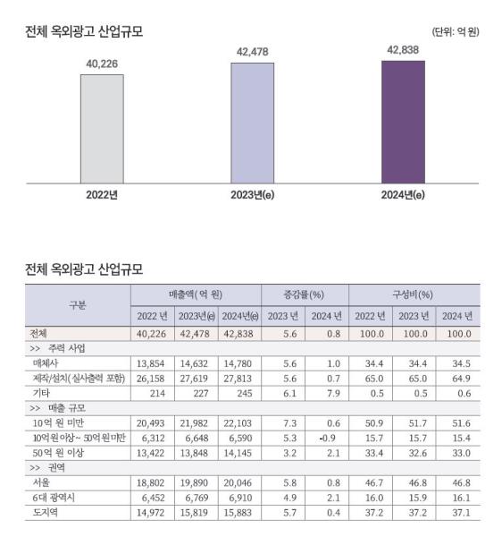 ¡ã 2023³â ¿Á¿Ü±¤°í »ê¾÷Åë°è °á°ú¸¦ »ìÆìº¸¸é, 2022³â ¿Á¿Ü±¤°í Àüü ¸ÅÃâ¾×Àº 4Á¶ 226¾ï ¿ø(2021³â 3Á¶ 5,666¾ï ¿ø)À¸·Î Áý°èµÇ¾ú´Ù. ÀÌ´Â Àü³â´ëºñ ´ë·« 5,000¾ï ¿ø »ó½ÂÇÑ ¼öÄ¡·Î Áö³ÇØ Åë°è¿¡¼ ¿¹ÃøÇÑ 3Á¶ 8,430¾ï ¿øÀ» ¿ôµµ´Â »ó½Â¼¼¶ó°í ÇÒ ¼ö ÀÖ´Ù. ±¤°í À¯Çüº° ¸ÅÃâ¾× °Ç¹°ºÎÂø ±¤°íÀÇ ¸ÅÃâ¾×Àº 2022³â 1Á¶ 5,912¾ï ¿øÀ¸·Î Áý°èµÇ¾ú´Ù. Á¦ÀÛ/¼³Ä¡ ¾÷üÀÇ ¸ÅÃâ ºñÁßÀÌ 84.8%·Î ³ôÀ¸¸ç, ¸ÅÃâ¾× 10¾ï ¿ø ¹Ì¸¸ÀÎ ¼Ò±Ô¸ð ¾÷üÀÇ ¸ÅÃâ¾× ºñÁßÀÌ 60.8%·Î ºñ±³Àû ³ô°Ô ³ªÅ¸³µ´Ù. 2023³â ¿¹»ó ¸ÅÃâ¾×Àº 1Á¶ 6,907¾ï ¿øÀ¸·Î 2022³â ´ëºñ 6.2% Áõ°¡ÇÒ °ÍÀ¸·Î ¿¹»óµÈ´Ù. ±³Åë½Ã¼³ ±¤°íÀÇ ¸ÅÃâ¾×Àº 2022³â 4,220¾ï ¿øÀ¸·Î Áý°èµÇ¾ú´Ù. ¸ÅÃ⠱Ը𺰷δ 50¾ï ¿ø ÀÌ»ó »ç¾÷üÀÇ ¸ÅÃâ ºñÁßÀÌ Àý¹Ý ÀÌ»ó(52.4%)À̸ç, ÁÖ·Â »ç¾÷º°·Î´Â ¸Åü»çÀÇ ºñÁßÀÌ 64.9%·Î ºñ±³Àû ³ô°Ô ³ªÅ¸³µ´Ù. 2023³â ¿¹»ó ¸ÅÃâ¾×Àº 4,399¾ï ¿øÀ¸·Î 2022³â ´ëºñ 4.3% Áõ°¡ÇÒ °ÍÀ¸·Î ¿¹»óµÈ´Ù. ±³Åë¼ö´Ü ±¤°íÀÇ ¸ÅÃâ¾×Àº 2022³â 4,043¾ï ¿øÀ¸·Î Áý°èµÇ¾úÀ¸¸ç, ¸Åü»çÀÇ ¸ÅÃâ ºñÁß(77.9%)ÀÌ »ó´ëÀûÀ¸·Î ³ô°Ô ³ªÅ¸³µ´Ù. 2023³â ¸ÅÃâ ±Ô¸ð´Â 3,797¾ï ¿øÀ¸·Î 2022³â ´ëºñ 6.1% °¨¼ÒÇÒ °ÍÀ¸·Î ¿¹»óµÇ¾ú´Ù. °ø°ø½Ã¼³¹° ±¤°íÀÇ ¸ÅÃâ¾×Àº 2022³â 2,144¾ï ¿ø ±Ô¸ð·Î Áý°èµÇ¾ú´Ù. ÁÖ·Â »ç¾÷º°·Î »ìÆìº¸¸é ¸Åü»ç°¡ 55.2%ÀÇ ºñÁßÀ» Â÷ÁöÇϰí ÀÖÀ¸¸ç, ±Ç¿ªº°·Î´Â ¼¿ï Áö¿ªÀÌ Àý¹Ý ÀÌ»ó(55.6%)À¸·Î ´Ù¸¥ Áö¿ª ´ëºñ »ó´ëÀûÀ¸·Î ³ôÀº ÆíÀÌ´Ù. 2023³â ¿¹»ó ¸ÅÃâ¾×Àº 2,421¾ï ¿øÀ¸·Î 2022³â ´ëºñ 12.9% Áõ°¡ÇÒ °ÍÀ¸·Î ¿¹»óµÈ´Ù. Áö¸é¼³Ä¡ ±¤°í ¸ÅÃâ¾×Àº 2022³â 1,311¾ï ¿øÀ¸·Î Áý°èµÇ¾ú´Ù. ¸ÅÃâ ±Ô¸ð 10¾ï ¿ø ¹Ì¸¸ÀÇ ¼Ò±Ô¸ð ¾÷ü°¡ 44.2%·Î ºñ±³Àû ³ô°Ô ³ªÅ¸³µ°í, ÁÖ·Â »ç¾÷º°·Î´Â Á¦ÀÛ/¼³Ä¡ ¾÷ü°¡ 70.6%ÀÇ ºñÁßÀ» Â÷ÁöÇϰí ÀÖ´Ù. 2023³â ¿¹»ó ¸ÅÃâ¾×Àº 1,485¾ï ¿øÀ¸·Î 2022³â ´ëºñ 13.3% Áõ°¡ÇÒ °ÍÀ¸·Î ¿¹»óµÈ´Ù. °ø°øÀå¼Ò ±¤°í ¸ÅÃâ¾×Àº 2022³â 2,456¾ï ¿øÀ¸·Î Áý°èµÇ¾ú´Ù. ÁÖ·Â »ç¾÷º°·Î´Â Á¦ÀÛ/¼³Ä¡ ¾÷üÀÇ ºñÁßÀÌ 51.1%·Î Àý¹Ý ÀÌ»óÀ» Â÷ÁöÇÏ¿´´Ù. 2023³â ¿¹»ó ¸ÅÃâ¾×Àº 2,614¾ï ¿øÀ¸·Î 2022³â ´ëºñ 6.4% Áõ°¡ÇÒ °ÍÀ¸·Î ¿¹»óµÈ´Ù. ¿©°¡½Ã¼³ ±¤°íÀÇ 2022³â ¸ÅÃâ¾×Àº 2,898¾ï ¿øÀ¸·Î Áý°èµÇ¾ú´Ù. ¸ÅÃâ ±Ô¸ð·Î´Â 50¾ï ¿ø ÀÌ»ó ¾÷üÀÇ ¸ÅÃâ ºñÁß(63.0%)ÀÌ »ó´ëÀûÀ¸·Î ³ô°Ô ³ªÅ¸³µ°í, ±Ç¿ªº°·Î´Â ¼¿ï Áö¿ªÀÇ ¾÷ü°¡ 71.6%¸¦ Â÷ÁöÇϰí ÀÖ´Â °ÍÀ¸·Î ³ªÅ¸³µ´Ù. 2023³â ¿¹»ó ¸ÅÃâ¾×Àº 3,240¾ï ¿øÀ¸·Î 2022³â ´ëºñ 11.8% Áõ°¡ÇÒ °ÍÀ¸·Î ¿¹»óµÈ´Ù. ¼îÇνü³ ±¤°í ¸ÅÃâ¾×Àº 2022³â 1,339¾ï ¿øÀ¸·Î Áý°èµÇ¾ú´Ù. ÁÖ·Â »ç¾÷º°·Î´Â ¸Åü»ç ¾÷ü(57.6%), ¸ÅÃ⠱Ը𺰷δ 10¾ï ¿ø ¹Ì¸¸ ¾÷ü(41.6%)°¡ ºñ±³Àû ³ôÀº ºñÁßÀ» º¸¿´´Ù. 2023³â ¿¹»ó ¸ÅÃâ¾×Àº 1,540¾ï ¿øÀ¸·Î 2022³â ´ëºñ 15.0% Áõ°¡ÇÒ °ÍÀ¸·Î ¿¹»óµÈ´Ù. À¯µ¿ ±¤°í ¸ÅÃâ¾×Àº 2022³â 2,648¾ï ¿øÀ¸·Î Áý°èµÇ¾ú´Ù. ÁÖ·Â »ç¾÷º°·Î´Â Á¦ÀÛ/¼³Ä¡ ¾÷ü°¡ 94.6%·Î ´ëºÎºÐÀÇ ¸ÅÃâ ºñÁßÀ» Â÷ÁöÇϰí ÀÖ´Â °ÍÀ¸·Î ³ªÅ¸³µÀ¸¸ç, ¸ÅÃ⠱Ը𺰷δ 10¾ï ¿ø ¹Ì¸¸ ¾÷ü°¡ 80.0%·Î ºñ±³Àû ³ô°Ô ³ªÅ¸³µ´Ù. 2023³â À¯µ¿ ±¤°í¹° ¸ÅÃâ¾×Àº 2,660¾ï ¿øÀ¸·Î 2022³â ´ëºñ 0.5% Áõ°¡ÇÒ °ÍÀ¸·Î ¿¹»óµÈ´Ù. ±¤°í¹° ½Ç»çÃâ·Â ¸ÅÃâ¾×Àº 2022³â 3,256¾ï ¿øÀ¸·Î Áý°èµÇ¾ú´Ù. ±Ç¿ªº°·Î´Â µµÁö¿ªÀÌ 61.2%·Î ´Ù¸¥ ±Ç¿ª¿¡ ºñÇØ »ó´ëÀûÀ¸·Î ³ô°Ô ³ªÅ¸³µ´Ù. 2023³â ¸ÅÃâ¾×Àº 3,415¾ï ¿øÀ¸·Î 2022³â ´ëºñ 4.9% Áõ°¡ÇÒ °ÍÀ¸·Î ¿¹»óµÈ´Ù.