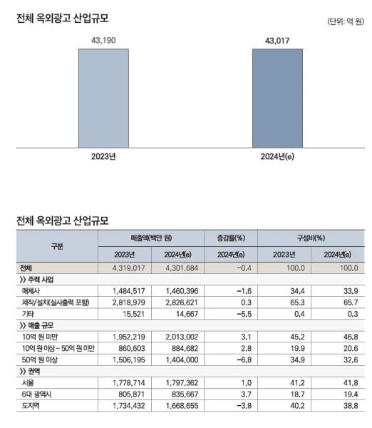 ¡ã Çѱ¹Áö¹æÀçÁ¤°øÁ¦È¸ ¿Á¿Ü±¤°í¼¾ÅͰ¡(ÀÌÇÏ Çѱ¹¿Á¿Ü±¤°í¼¾ÅÍ) 2024 ¿Á¿Ü±¤°í Åë°è¸¦ ¹ßÇ¥Çß´Ù. ÀÌ´Â 1³â°£(Á¶»ç ±â°£ 2023³â 1¿ùºÎÅÍ 12¿ù±îÁöÀÌ°í º»¹® µµÇ¥»óÀÇ 2024³âÀº ÃßÁ¤Ä¡)ÀÇ ¿Á¿Ü±¤°í »ê¾÷ Àü¹ÝÀÇ ÇöȲÀ» ÆÄ¾ÇÇÑ ÀÚ·á´Ù. Àüü ¸ÅÃâ¾× 4Á¶ 3,190¾ï ¿ø, ¿¹»ó ¿ôµµ´Â »ó½Â 2024³â ¿Á¿Ü±¤°í »ê¾÷Åë°è °á°ú¸¦ »ìÆìº¸¸é, 2023³â ¿Á¿Ü±¤°í Àüü ¸ÅÃâ¾×Àº 4Á¶ 3,190¾ï ¿øÀ¸·Î Á¶»çµÇ¾ú´Ù. ÀÌ´Â Àü³â ´ëºñ(2022³â 4Á¶ 226¾ï ¿ø) »ó½ÂÇÑ ¼öÄ¡´Ù. ÀÛ³â Åë°è¿¡¼ 2023³â ÃßÁ¤Ä¡(4Á¶ 2,478¾ï ¿ø)¸¦ ¿ôµµ´Â »ó½ÂÀ» º¸¿´´Ù. 2024³â Àüü ¸ÅÃâ¾× ÃßÁ¤Ä¡´Â 4Á¶ 3,017¾ï ¿øÀ¸·Î ¼ÒÆø °¨¼ÒÇÒ °ÍÀ¸·Î ¿¹»óÇß´Ù. ¼¼ºÎ À¯Çüº°·Î »ìÆìº¸¸é, °Ç¹°ºÎÂø ±¤°íÀÇ ¸ÅÃâ¾×ÀÌ 2023³â 1Á¶ 7,264¾ï ¿øÀ¸·Î °¡Àå ¸¹¾ÒÀ¸¸ç, ÀÌ´Â Àüü ¿Á¿Ü±¤°í ½ÃÀåÀÇ ¾à 40.0%¸¦ Â÷ÁöÇϰí ÀÖ´Â °ÍÀ¸·Î ³ªÅ¸³µ´Ù. ±³Åë½Ã¼³ ±¤°íÀÇ °æ¿ì¿¡´Â 2023³â 4,642¾ï ¿ø, ±³Åë¼ö´Ü±¤°í´Â 4,280¾ï ¿øÀ¸·Î Àüü ¿Á¿Ü±¤°í ½ÃÀåÀÇ ¾à 10% Á¤µµ¸¦ Â÷ÁöÇÏ¿´´Ù. °ø°ø½Ã¼³¹° ±¤°í, Áö¸é¼³Ä¡ ±¤°í ¹× °ø°øÀå¼Ò ±¤°í´Â 2023³â Àüü ¿Á¿Ü±¤°í ½ÃÀå¿¡¼ Â÷ÁöÇÏ´Â ºñÁßÀÌ °¢°¢ 5.1%, 3.7%, 6.2%·Î ³ªÅ¸³µ´Ù. ¶ÇÇÑ, ¿©°¡½Ã¼³ ³»ºÎ±¤°íÀÇ °æ¿ì¿¡´Â 2023³â 2,995¾ï ¿øÀ¸·Î Àüü ½ÃÀåÀÇ 6.9%¸¦ Â÷ÁöÇϰí ÀÖÀ¸¸ç, ¼îÇνü³ ±¤°í¿Í À¯µ¿ ±¤°í´Â °¢°¢ Àüü ½ÃÀå¿¡¼ 3.4%¿Í 6.2%ÀÇ ºñÁßÀ» Â÷ÁöÇϰí ÀÖ´Ù. ±¤°í¹° ½Ç»çÃâ·ÂÀº 2023³â 3,384¾ï ¿øÀ¸·Î Àüü ¸ÅÃâÀÇ 7.8%·Î ³ªÅ¸³µ´Ù. 2024³âºÎÅÍ ¾Æ³¯·Î±× ±¤°í¿Í µðÁöÅÐ ±¤°í¿¡ ÇØ´çÇÏ´Â ¼ÒºÐ·ù Ç׸ñÀº ´ÙÀ½°ú °°ÀÌ ºÐ·ùÇÏ¿© Áý°èÇß´Ù. ¾Æ³¯·Î±× ±¤°í´Â ÀϹÝÁ¶¸í, °¡¸²°£ÆÇ, ³»ºÎ ¶óÀÌÆ®¹Ú½º, ³»ºÎ ÀμâÇü(Á¶¸í/ºñÁ¶¸í), ³×¿Â, µ¹Ãâ°£ÆÇ, ·Îºñ ÀμâÇü, ºÎ±â¿ª¸í, ½ºÅ©¸°µµ¾î ÀμâÇü, ÀÏ¹Ý ºÎÂøÇü, ±¤Àå ±¤°í(°øÇ×, öµµÇü, Ç׸¸ µî)¸¦ Æ÷ÇÔÇÑ´Ù. ±×¸®°í µðÁöÅÐ ±¤°í´Â ³»ºÎ µðÁöÅÐ, ¿ÜºÎ µðÁöÅÐ, ·Îºñ µðÁöÅÐ, ½ºÅ©¸°µµ¾î µðÁöÅÐ, »ó¿µ°ü ³» ½ºÅ©¸° ±¤°í¸¦ Æ÷ÇÔÇÑ´Ù. ÀÌ¿¡ µû¸¥ ±âÁØÀ» Àû¿ëÇÏ¿© Áý°èÇÑ 2023³â ¾Æ³¯·Î±× ±¤°í ¸ÅÃâ¾×Àº 2Á¶ 8,118¾ï ¿øÀ¸·Î Á¶»ç µÇ¾úÀ¸¸ç, µðÁöÅÐ ±¤°í ¸ÅÃâ¾×Àº 1Á¶ 5,072¾ï ¿øÀ¸·Î ³ªÅ¸³µ´Ù. 2024³â ¾Æ³¯·Î±× ±¤°í ¸ÅÃâ¾×Àº 2023³â ´ëºñ ¾à 3.1% °¨¼ÒÇÒ °ÍÀ¸·Î ¿¹»óµÇ¾úÀ¸¸ç, µðÁöÅÐ ±¤°í ¸ÅÃâ¾×Àº 2024³â 1Á¶ 5,763¾ï ¿øÀ¸·Î 2023³â¿¡ ºñÇØ ¾à 4.6% Áõ°¡ÇÒ °ÍÀ¸·Î ¿¹»óµÈ´Ù.